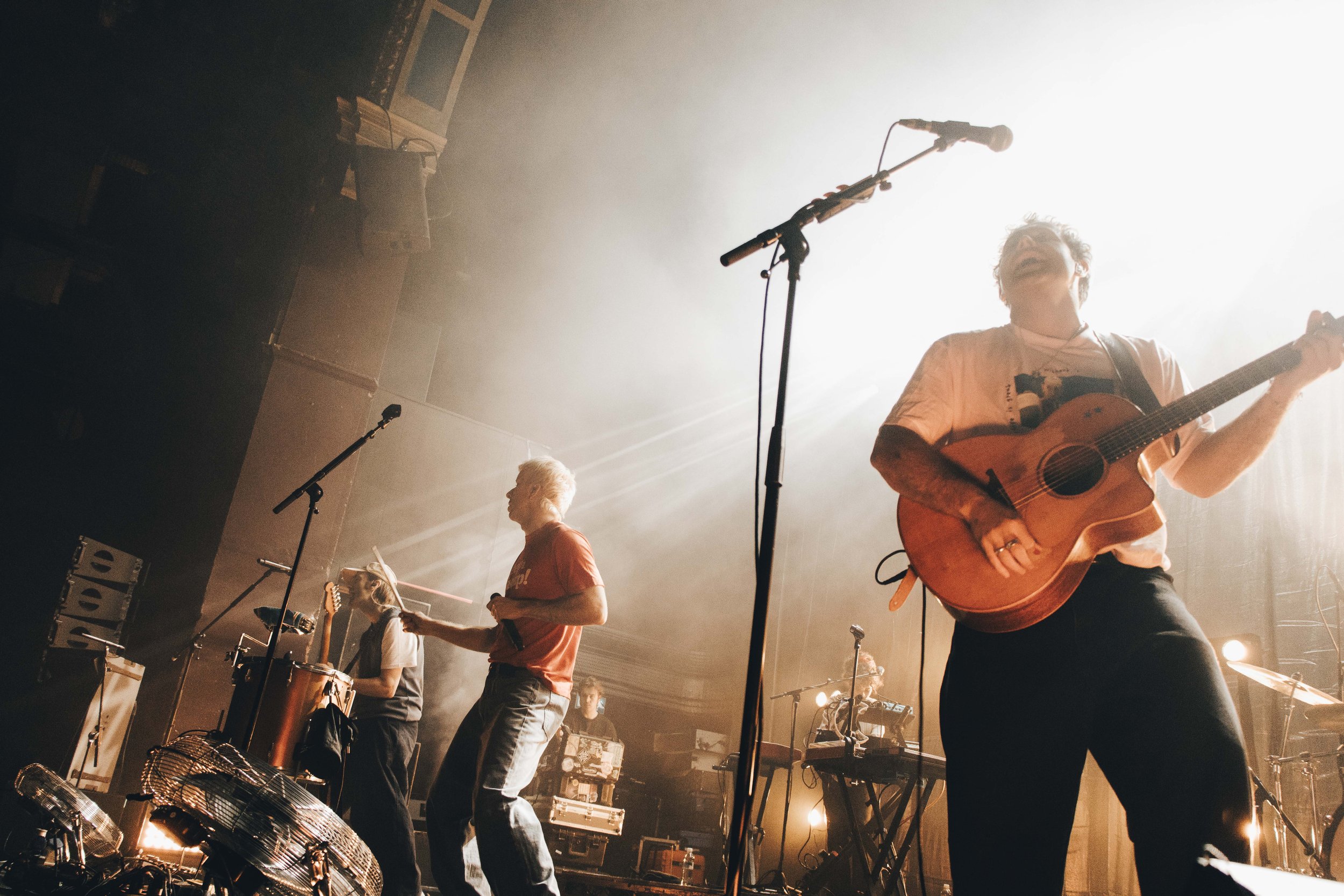 Bouncing onto the stage, Good Neighbours emerged from the shadows to a heavily backlit stage, creating silhouettes of the band, including lead singer Oli Fox’s iconic single drum and tambourine combo. Striking the drum to create a bass pounding introduction, Good Neighbours began their show with ‘Suburbs' which set the precedent for the night.
