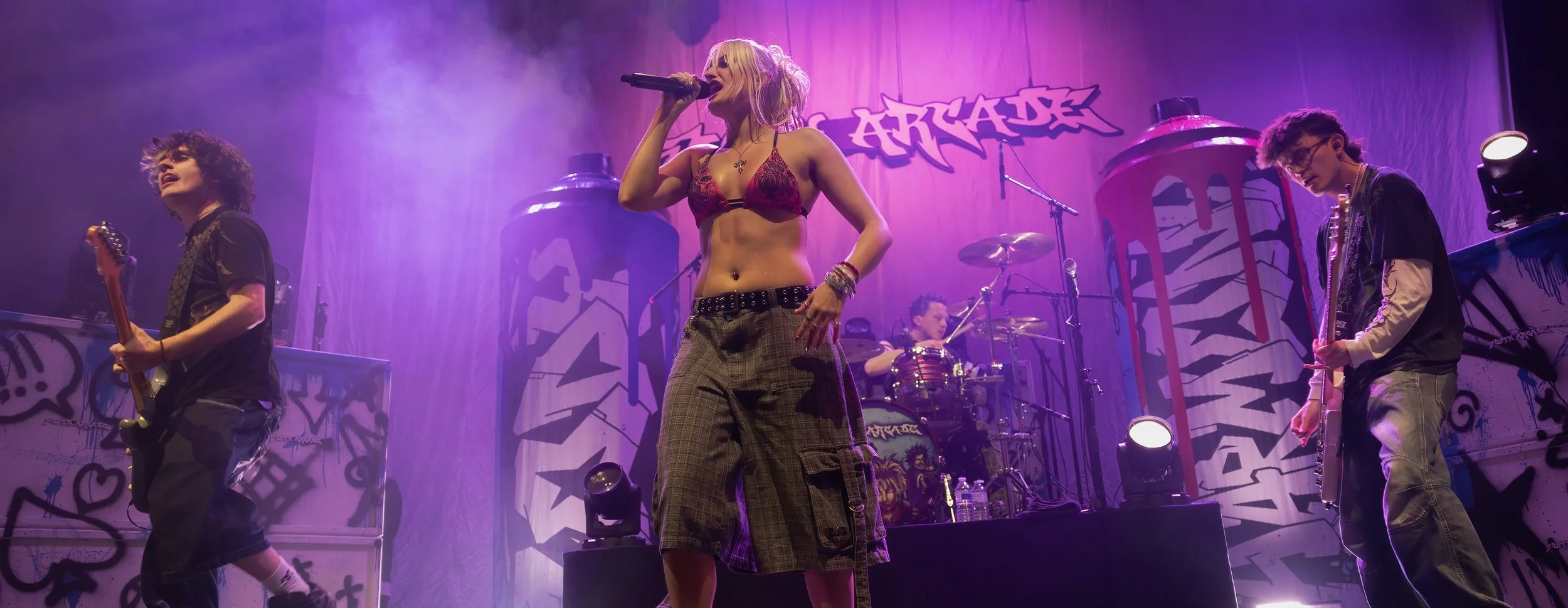 South Arcade’s stage setup was impossible to miss—four giant graffiti cans flanked the stage, with the band’s logo displayed proudly behind a raised platform for the drums. Two small platforms on either side hinted that the guitarists had plans for them later (spoiler: they did). Just before 9 p.m., Harmony Cavelle (vocals), Harry Winks (guitar), Ollie Green (bass), and Cody Jones (drums) hit the stage.